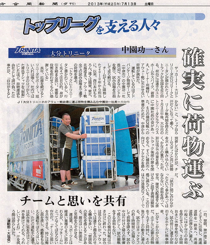 2010年より株式会社大分フットボールクラブ様にご契約いただき、弊社代表の中園功一が専属ドライバーを務める、サッカーJ1大分トリニータの機材運搬業務に関して大分合同新聞の取材を受け、このたび「トップリーグを支える人々」のコーナーで紹介されました。